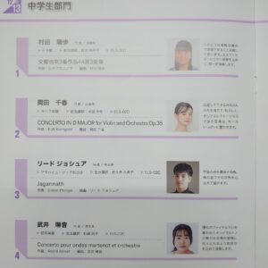 中学生部門は、海外からの参加者2名を含む13名がエントリー。キハラ楽器からは、岡田千春さん(黒瀬中1年)が2年連続で出演。素晴らしい演奏を披露し、満員の会場から大きな拍手を受けていました。